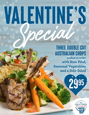 Celebrate Valentine’s Day with savory flavors. Lamb chops are the featured special—perfect for a Mediterranean-inspired date night.